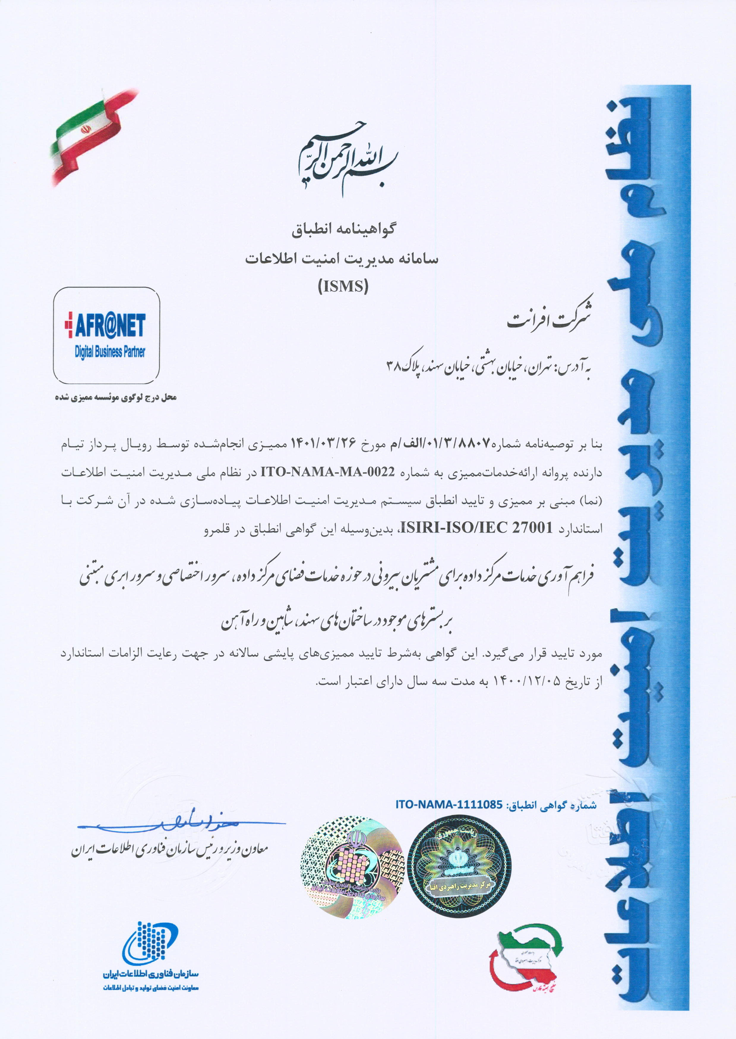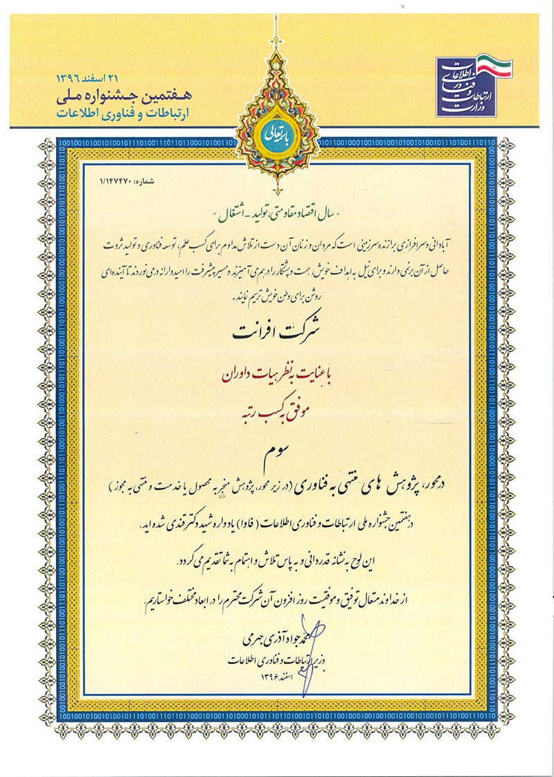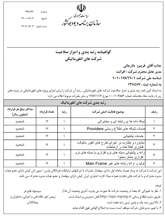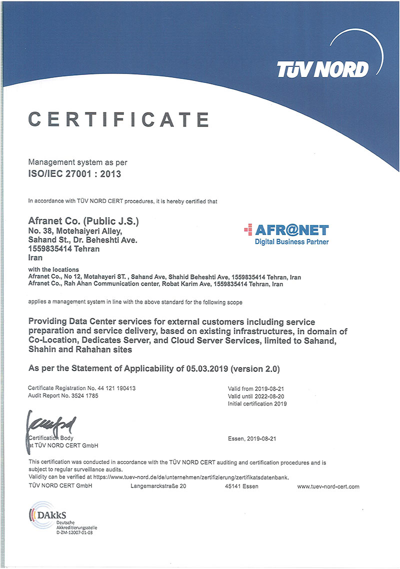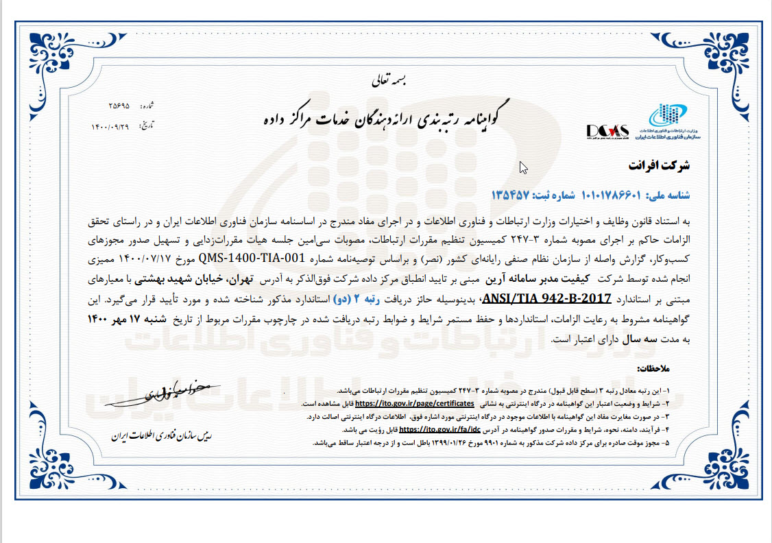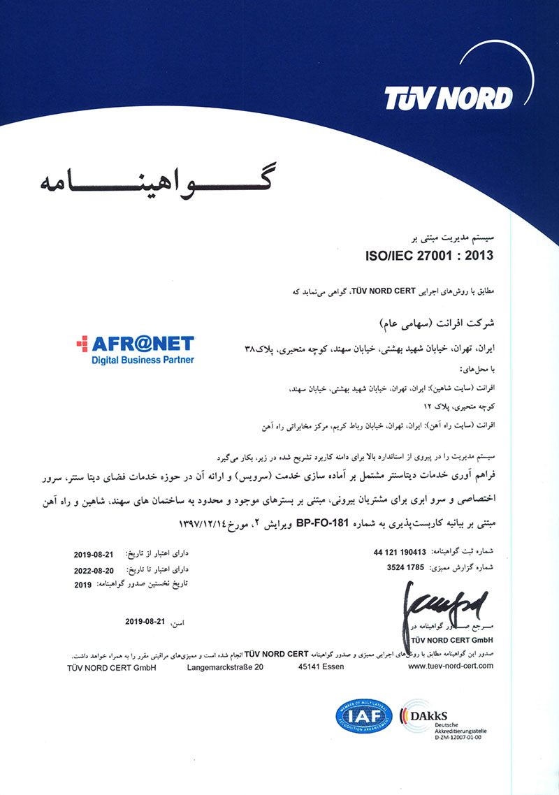 شرکت افرانت، پیشرو در ارایه خدمات و راهکارهای مبتنی بر دیتا شامل پهنای باند اینترنت، شبکه انتقال، خدمات ارتباطی، دیتاسنتر و خدمات ابری، در راستای رویکردهای توسعه پایدار، بهبود خدمات و افزایش سهم بازار و به منظور تسهیل فرصتهای افزایش رضایت مشتریان، اطمینان از ارایه خدمات منطبق با الزامات ذی نفعان و پرداختن به ریسک و فرصت های مرتبط با محیط کسب و کار، صیانت از داراییهای ارزشمند اطلاعاتی و همچنین ایجاد بسترهای تداوم کسب و کار، از استانداردهای ISO 9001:2015، ISO 10002:2018، 10004:2018ISO، ISO/IEC 27001:2013، ISO/IEC 20001-1:2018، ISO 10015:2019، ISO30401:2018 برای سیستمهای مدیریتی یکپارچه خود بهره میبرد.