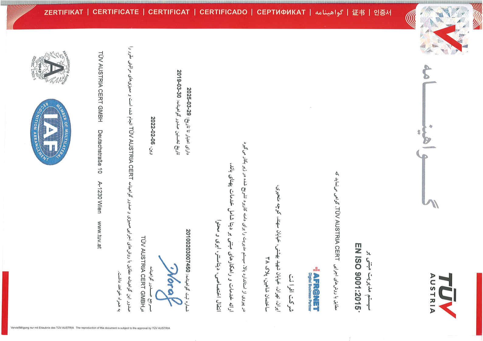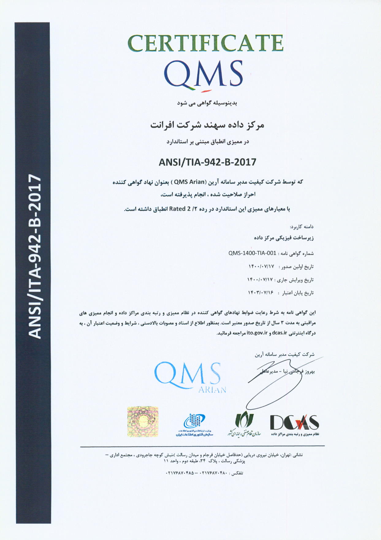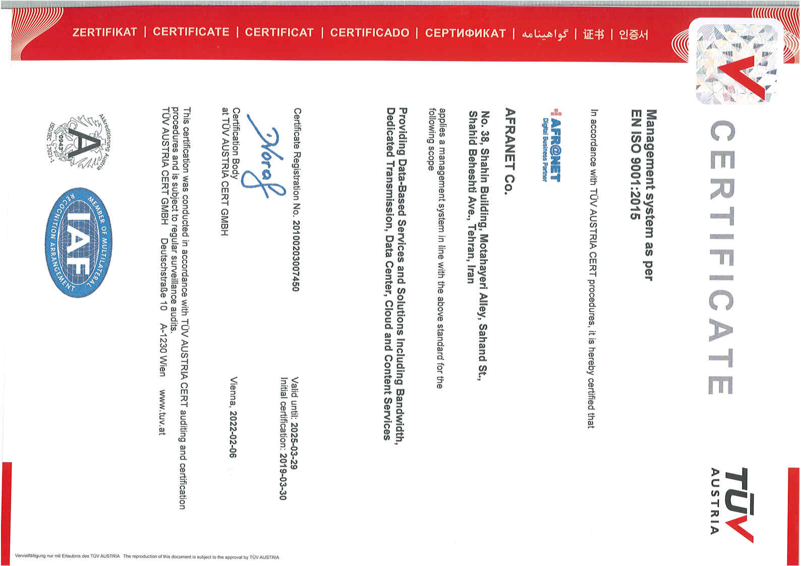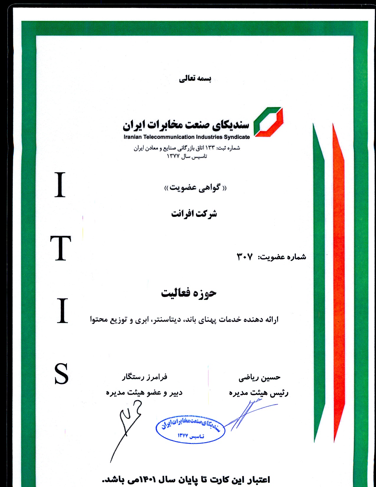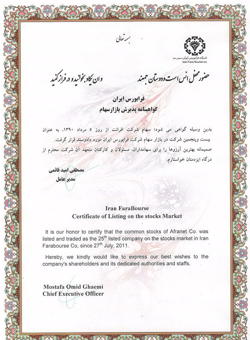 شرکت افرانت، پیشرو در ارایه خدمات و راهکارهای مبتنی بر دیتا شامل پهنای باند اینترنت، شبکه انتقال، خدمات ارتباطی، دیتاسنتر و خدمات ابری، در راستای رویکردهای توسعه پایدار، بهبود خدمات و افزایش سهم بازار و به منظور تسهیل فرصتهای افزایش رضایت مشتریان، اطمینان از ارایه خدمات منطبق با الزامات ذی نفعان و پرداختن به ریسک و فرصت های مرتبط با محیط کسب و کار، صیانت از داراییهای ارزشمند اطلاعاتی و همچنین ایجاد بسترهای تداوم کسب و کار، از استانداردهای ISO 9001:2015، ISO 10002:2018، 10004:2018ISO، ISO/IEC 27001:2013، ISO/IEC 20001-1:2018، ISO 10015:2019، ISO30401:2018 برای سیستمهای مدیریتی یکپارچه خود بهره میبرد.